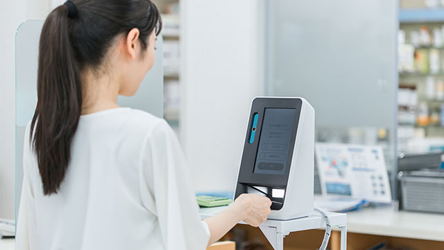 従来、病院や歯科医院で受付をする際は、スタッフとの対面式でしたが、マイナンバーカードを保険証代わりに使えば、対面で接触することなく、カードリーダーにカードをかざすだけで受付が自動化されます。