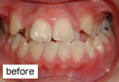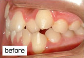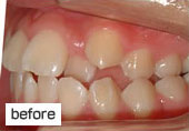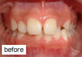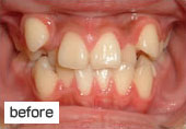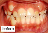| 治療前 | 顎の大きさが歯に対してかなり小さいため、歯列が凸凹で八重歯になり、前から2番目の歯は内側に入っていました。 |